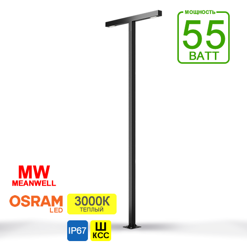 IO-INTEGRAL Т 55Sх2 - Фонарный стальной столб с светильником мощностью 55 Ватт, производительностью 8700 Лм. В основе стоят светодиоды OSRAM. Разработан для открытых территорий и выполняет функции общего освещения. При заказе возможно выбрать высоту столба от 3-х до 6-и метров.